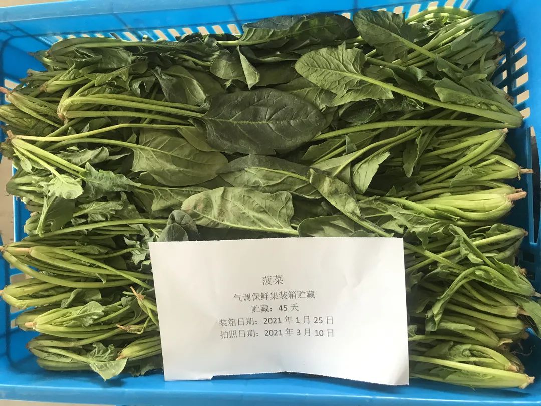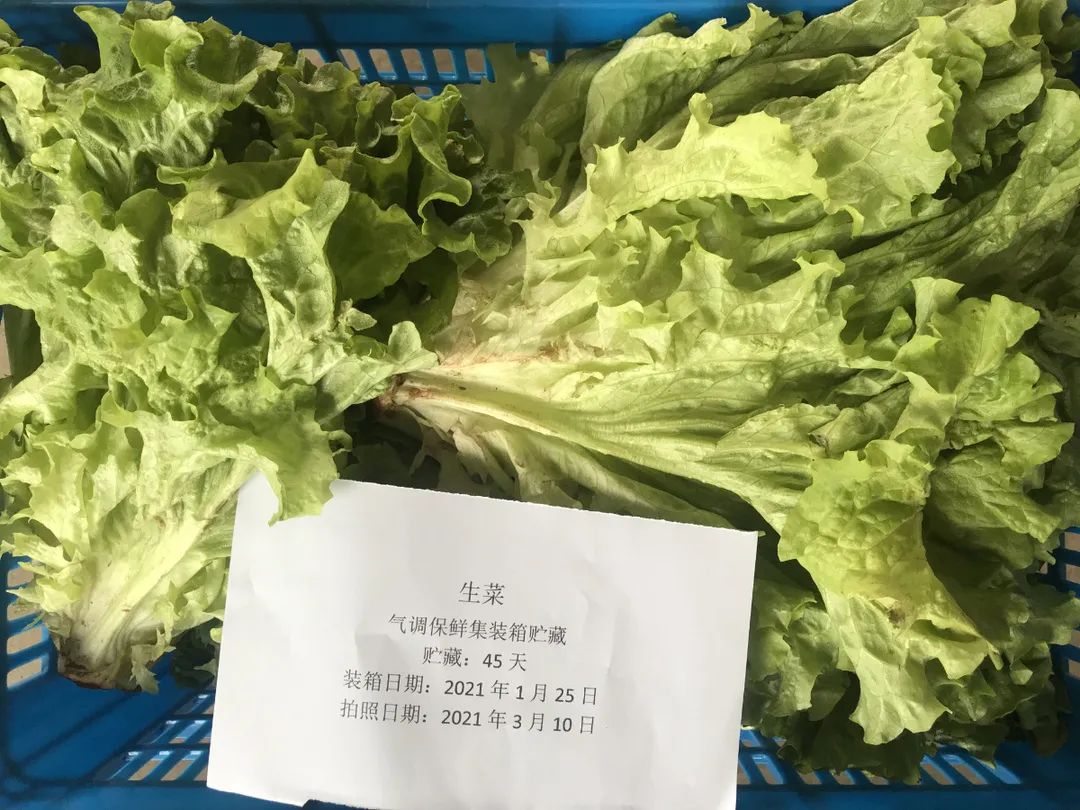 在廠內(nèi)進行技術(shù)研發(fā)固然重要,在實踐中跟蹤驗證才能將裝備性能落實好。在廠內(nèi)完成保鮮試驗后,氣調(diào)冷藏集裝箱又馬不停蹄趕往山東壽光開展蔬菜基地陸用保鮮試驗,在北方寒冬季節(jié)里,測試設(shè)備的應(yīng)用工況,并作為氣調(diào)冷藏集裝箱走向大棚蔬菜保鮮的一次前期基礎(chǔ)性工作,全程跟蹤設(shè)備運行及試驗情況。2021125~311日,在貯藏45天后,除西蘭花、花椰菜、小白菜外,生菜、菠菜、油麥菜、上海青4種菜品,幾乎仍保持著剛?cè)霂鞎r的新鮮狀態(tài),失重率及折損率均不大于10%15%。能達到此保鮮效果,也與基地果蔬好的品種與品質(zhì)有關(guān)。